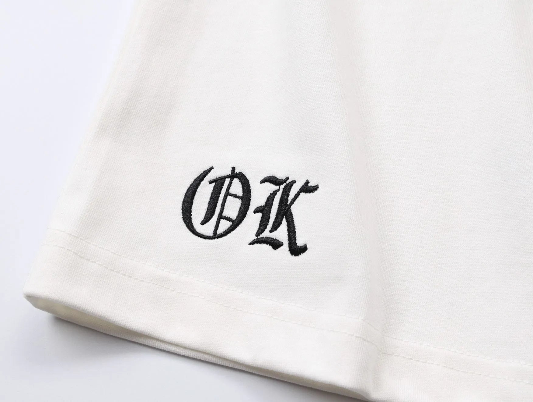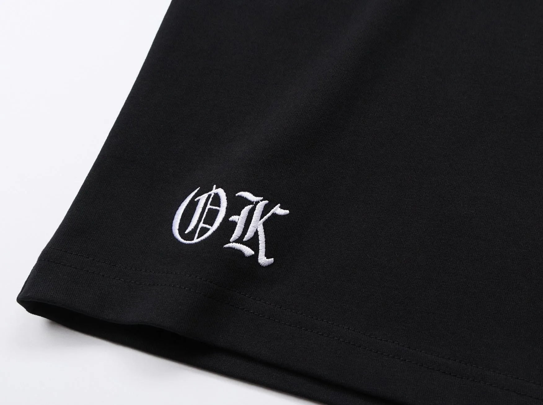The cross and lettering embroidery is accented with Sanskrit character motifs, and its appearance changes depending on the angle and light.